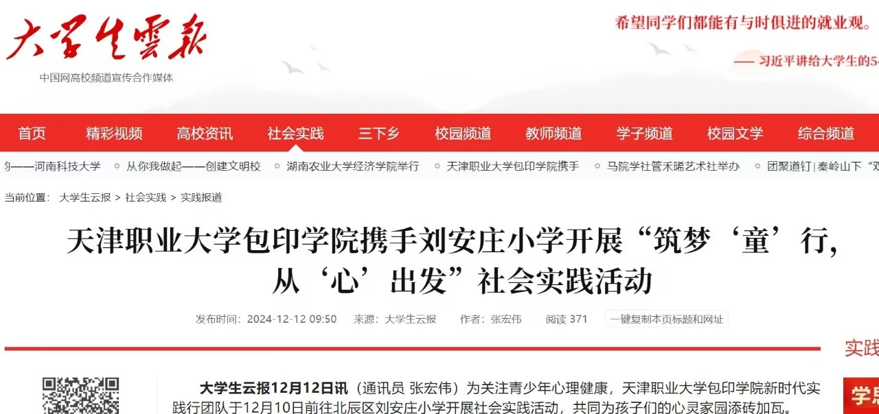 为贯彻落实习近平总书记关于青少年心理健康的重要指示精神,包印学院新时代实践行团队于12月10日前往北辰区刘安庄小学开展“筑梦‘童’行,从‘心’出发”社会实践活动,共同为孩子们的心灵家园添砖加瓦。此项活动得到了大学生云报的宣传报道。