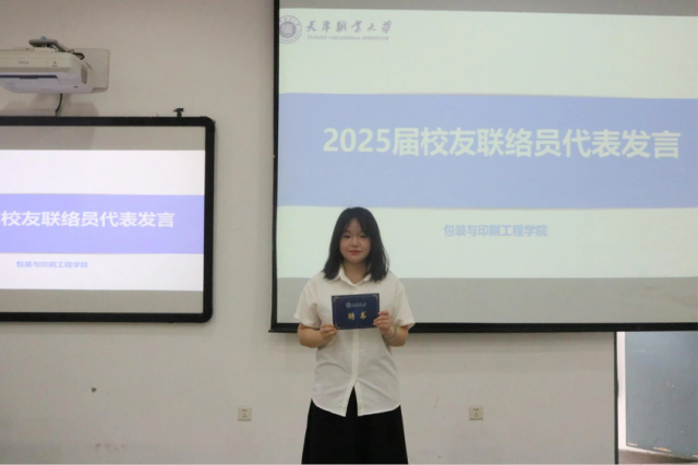 “在天职大的时光,是我人生中最珍贵的礼物。”2022级包装工程技术专业刘双硕同学作为代表发言,她动情地说:“我们会当好母校的‘传声筒’、校友的‘贴心人’,让每一位校友都能感受到母校的牵挂!今日我以母校为荣,明日母校以我为傲。”